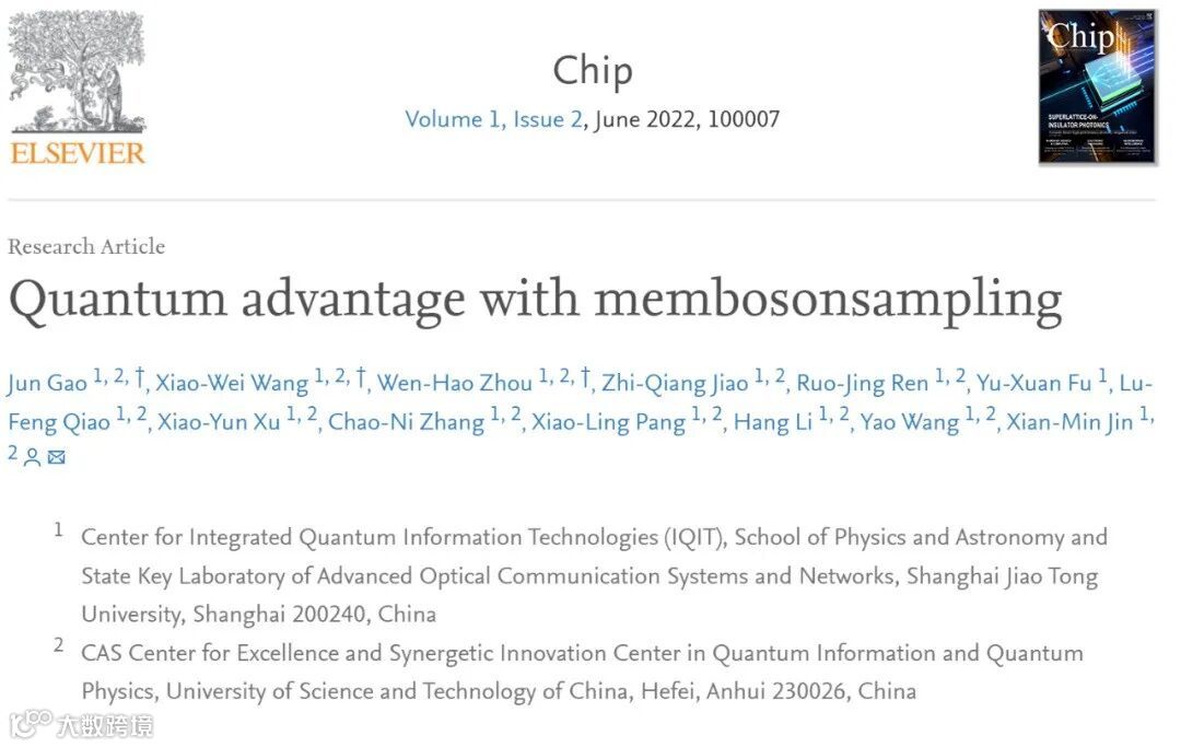 近日,上海交通大学金贤敏团队的最新研究成果「Quantum advantage with membosonsampling」¹为题在Chip上发表,共同第一作者为高俊、王潇卫、周文豪,通讯作者为金贤敏。Chip是全球唯一聚焦芯片类研究的综合性国际期刊,是入选了国家高起点新刊计划的「三类高质量论文」期刊之一。