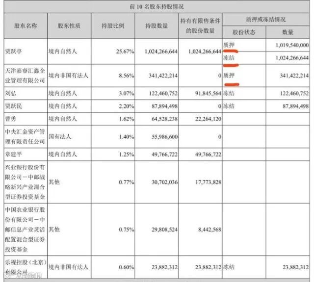 乐视网2017年三季报贾跃亭持股冻结、质押情况: