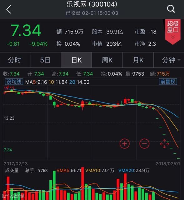 2月1日,乐视网迎来复牌以后的第7个跌停板,公司股价报收7.34元/股。跌停板上,仍有612万手的卖单堆积。目前,公司市值为293亿元,7个交易日蒸发了319亿元市值。