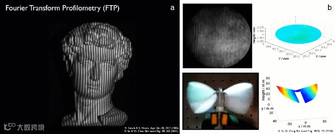 图2 傅里叶变换条纹投影轮廓术(FTP)。(a) FTP基本原理9 ;(b) 鼓面与微飞行器翅膀的kHz FTP三维成像结果10
