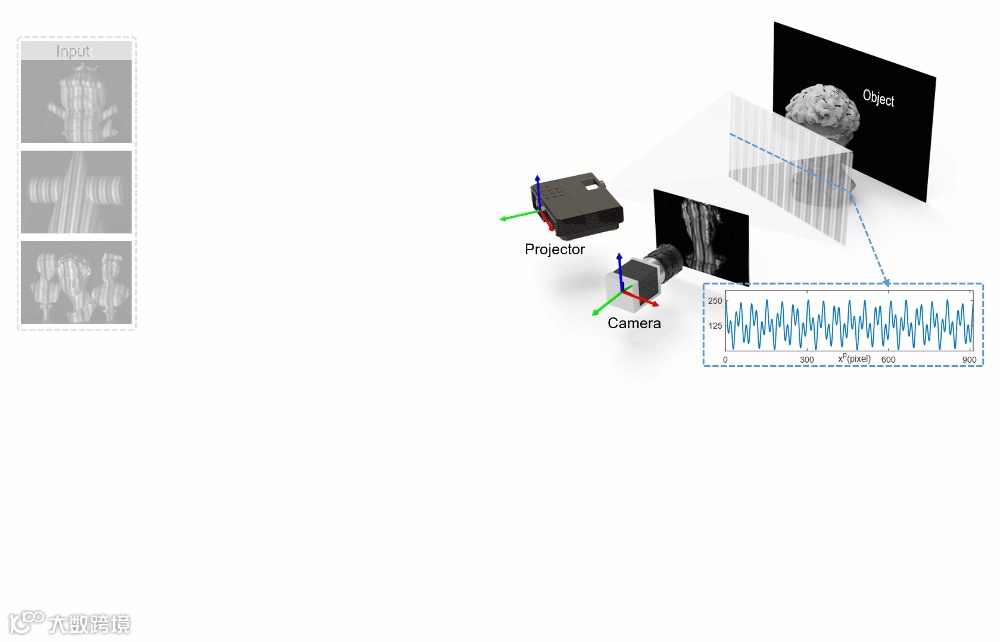 随着光电信息技术的快速发展,三维成像与传感已成为光学计量和信息光学领域的最重要的研究方向之一。“二维摄像”向“三维传感”的演变也将成为继黑白到彩色、低分辨率到高分辨率、静态图像到动态影像后的“第四次影像革命”。结构光投影技术因其非接触、高分辨、高速和全场自动化等优点,成为目前最具代表性的三维成像技术之一。而其中对于宏观物体三维测量的方法中,基于相位测量的条纹投影轮廓术(Fringe projection profilometry,FPP)[图1] 的测量精度最高,因此在智能制造、逆向工程、工业检测、文物保护等众多领域得到广泛应用。