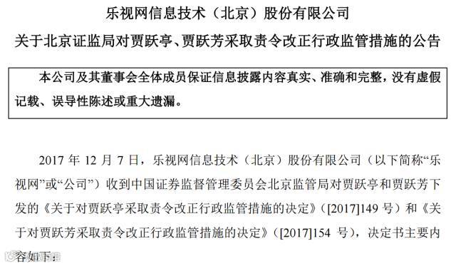 对此,12月7日,北京证监局对贾跃亭姐弟下发《关于对贾跃亭采取责令改正行政监管措施的决定》和《关于对贾跃芳采取责令改正行政监管措施的决定》,要求两人就拒不履行承诺的违规行为出具书面整改报告,报告内容包括但不限于:你对存在问题的认识情况、采取的具体整改措施、未整改问题的原因、后续整改计划、整改期限等。