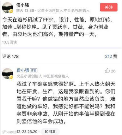 12月25日,盛大文学原CEO、火星小说创始人侯小强在微博上爆料称,“今天在洛杉矶试了FF91,设计、性能,原地打转,加速…堪称惊艳。见了贾跃亭、甘薇,身为创业者,由衷地为他们高兴。期待量产的一天。”
