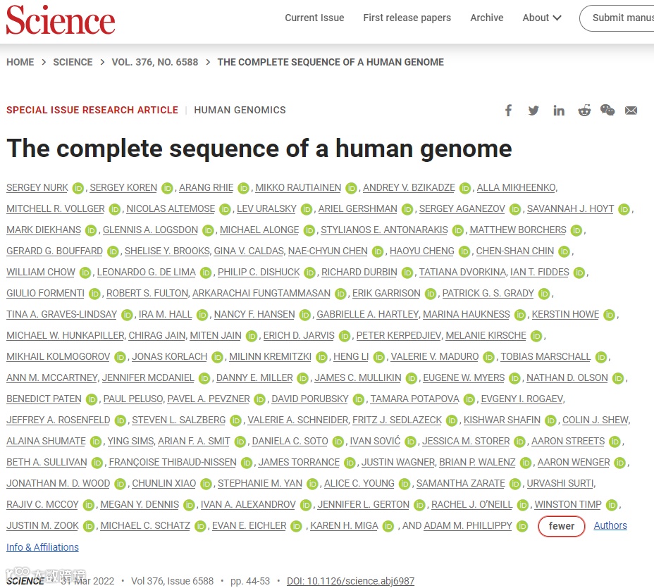2022年3月31日,端粒到端粒 (T2T) 联盟在Science 在线发表题为“The complete sequence of a human genome”的研究论文(该文章入选为Science封面文章),该研究针对剩余 8% 的基因组,提供了人类基因组的完整 30.55 亿碱基对序列 T2T-CHM13,其中包括除 Y 之外的所有染色体的无间隙装配,纠正了之前的参考序列,并介绍了近 2 亿个碱基对序列,其中包含 1956 个基因预测,其中 99 个预测为蛋白质编码。完成的区域包括所有着丝粒卫星阵列、最近的节段重复和所有五个近端着丝粒染色体的短臂。