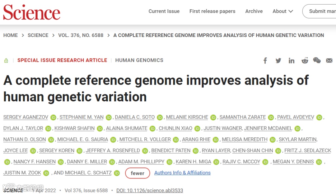 另外,2022年4月1日,约翰霍普金斯大学Sergey Aganezov等人在Science 在线发表题为“A complete reference genome improves analysis of human genetic variation”的研究论文,Telomere-to-Telomere CHM13 基因组增加了近 2 亿个碱基对序列,纠正了数千个结构错误,并为临床和功能研究解锁了人类基因组中最复杂的区域。该研究展示了该参考序列如何普遍改进读取映射和变体调用。 该研究在以前未解决的区域中识别出每个样本数十万个变体,展示了 T2T-CHM13 参考对进化和生物医学发现的重要作用。同时,该参考序列消除了每个样本数以万计的虚假变异,包括将 269 个医学相关基因中的假阳性减少多达 12 倍。由于变异发现的这些改进以及种群和功能基因组资源,T2T-CHM13 将取代 GRCh38 作为人类遗传学的主要参考。