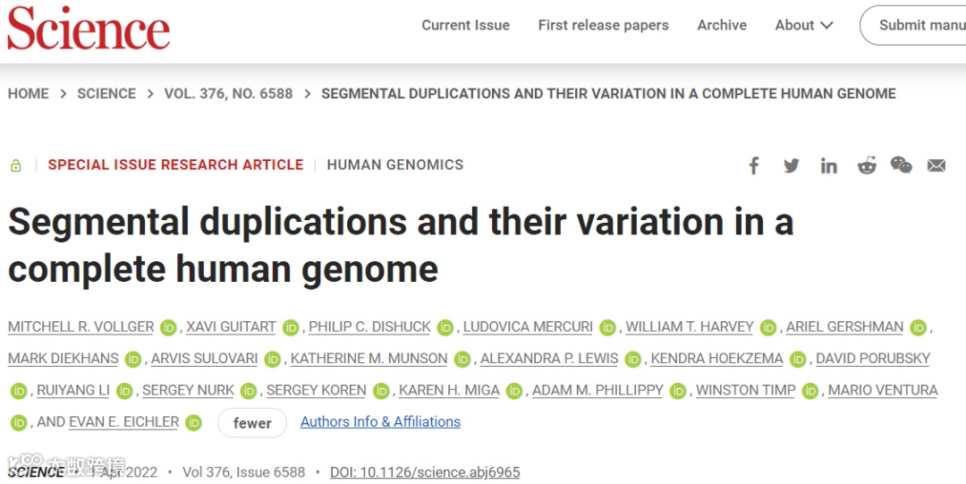 2022年4月1日,华盛顿大学Mitchell R. Vollger等人在Science 在线发表题为“Segmental duplications and their variation in a complete human genome”的研究论文,该研究使用完整的端粒到端粒人类基因组 (T2T-CHM13),提供了人类片段重复 (SD)组织的全面视图。SD 占额外序列的近三分之一,将全基因组估计从 5.4% 增加到 7.0% [2.18 亿碱基对 (Mbp)]。对 268 个人类基因组的分析表明,91% 的先前未解析的 T2T-CHM13 SD 序列 (68.3 Mbp) 更好地代表了人类拷贝数变异。比较来自人类 (n = 12) 和非人类灵长类动物 (n = 5) 基因组的长读长组装,该研究系统地重建了生物医学相关和重复基因的进化和结构单倍型多样性。该分析揭示了人类与其他灵长类动物之间 SD 组织结构杂合性和进化差异的模式。
