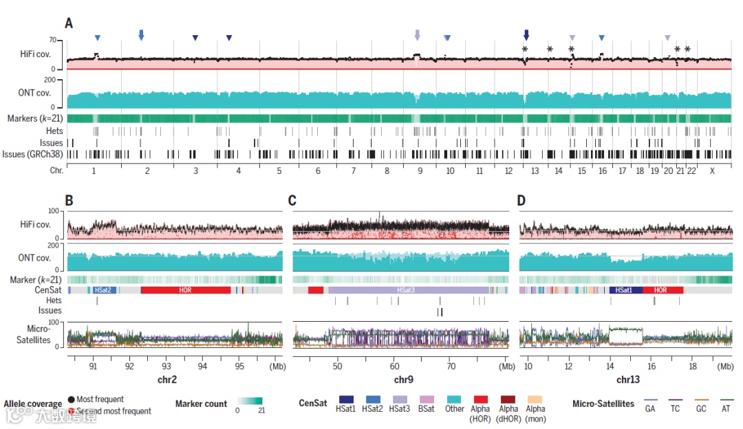 GRCh38 参考组装包含 151 兆碱基对 (Mbp) 的未知序列,分布在整个基因组中,包括着丝粒周围和亚端粒区域、扩增基因阵列和核糖体 DNA (rDNA) 阵列,所有这些都是基本基因组细胞过程所必需的。一些最大的参考缺口包括人类卫星(HSat)重复阵列和所有五个近端着丝粒染色体的短臂,它们在 GRCh38 中表示为未知碱基的多兆碱基延伸。尽管人类基因组计划和 GRC 都完成了提高参考质量的努力,但在随后的几年中缩小剩余差距的进展有限。