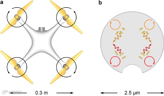 纳米发动机的原理决定了即使使用宽场光同时照射四个发动机,也不会造成对各个发动机控制的串扰。另外由于圆偏振光的连续旋转对称性,发动机对驱动光的响应也与器件的朝向角度无关。这就意味着,当使用两个波长的重叠的宽场光来驱动微米无人机时,所有的操控仅仅通过调控每个发动机对应的光分量的功率就可以实现。这一点也是和四旋翼无人机一致的地方,即控制机理非常简单。