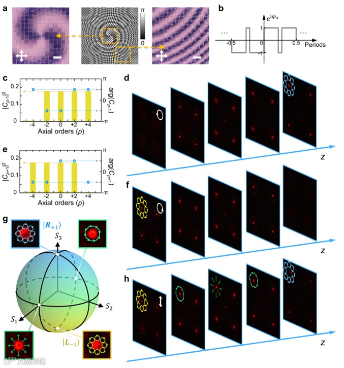 根据不同需要,课题组针对性优化达曼编码函数,精准设计四种相位成分的结构参数,可构筑两类液晶微纳结构,分别实现了OAM模式全同与OAM模式随传播变化的三维阵列。其一,不集成PB透镜结构,该液晶几何相位元件在圆偏振光入射时产生三维涡旋光阵列,在线偏振光入射时产生三维矢量光阵列;入射任意偏振态,理论上可构造任意庞加莱球光束的三维全同阵列。其二,集成特定焦距的PB透镜结构,根据“偏移-重合”设计原理,该元件在正交圆偏振光入射时产生轴向偏移的涡旋光阵列,在线偏振光入射时产生相反拓扑荷涡旋光、正交偏振矢量光的混合三维阵列,即实现了高阶庞加莱球上四种典型OAM光束的轴向交替(图3)。此外,课题组还测试了器件在不同波长下的工作效果,实验结果表明,所提出的液晶几何相位元件具有电控多波长适用的特点。