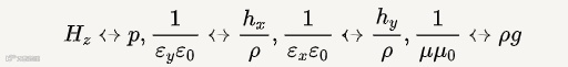 其中p是流体表面的静水压, , 是流体密度。它不仅适用各向异性且非均匀的水深,也适用非均匀重力系统。它可与横磁模式Maxwell方程组类比: