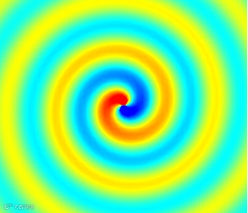 图3 (a)具有角动量的水波激发单向传播水波示意图