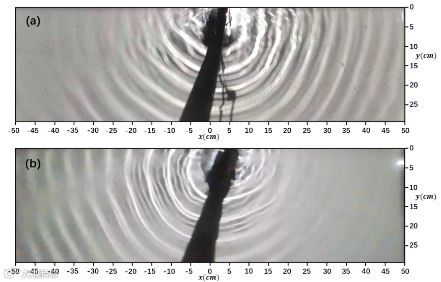 为了验证理论构想,研究人员用3D打印机打印出了如图3 (b)所示的一维凹槽阵列,该结构尺寸为 , , ,考虑到浅水近视,实验中的水深为 。实验结果如图5所示,调整螺旋桨和一维凹槽阵列的距离为1cm,旋转方向为顺时针旋转,可以看到波源左侧的扇形区域的水波振幅被大大减弱,形成了一个向右传播的单向水波,如图5(a)所示。通过改变螺旋桨的旋转方向,可以改变单向水波的传播方向,当螺旋桨的旋转方向为逆时针时,可以看到波源右侧的扇形区域的水波振幅被大大减弱,形成了一个向左传播的单向水波,如图5(b)所示。