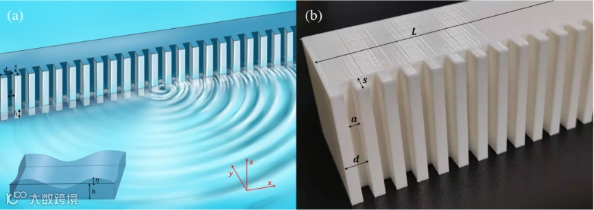 利用Spoof-SPPs的原理,研究人员设计出了如图3(b)所示的超材料结构,其中凹槽的宽度为a,循环周期宽度为d,凹槽纵深为s,他们利用该结构实现了如图3(a)所示的水波单向传播。