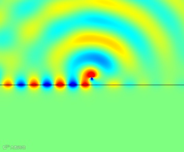 从模拟结果可以看出,波源左侧的水波振幅被大大减弱,波源右侧的水波振幅被大大增强,形成了向右传播的单向水波。