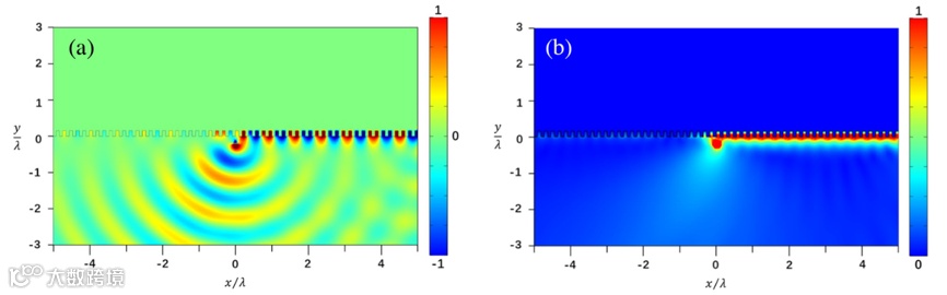 一对圆偏振的偶极子在自由空间中可以激发出涡旋波,其磁场z分量振幅关于波源左右对称,如图2(a)所示。2013年Francisco J. Rodríguez-Fortuño等人进一步发现,涡旋波所激发的表面等离激元传播时,波源一边的电磁波振幅被大大减弱,另一边电磁波的振幅大大增强,从而激发出单向传播的表面等离激元[2],如图2(b)所示。