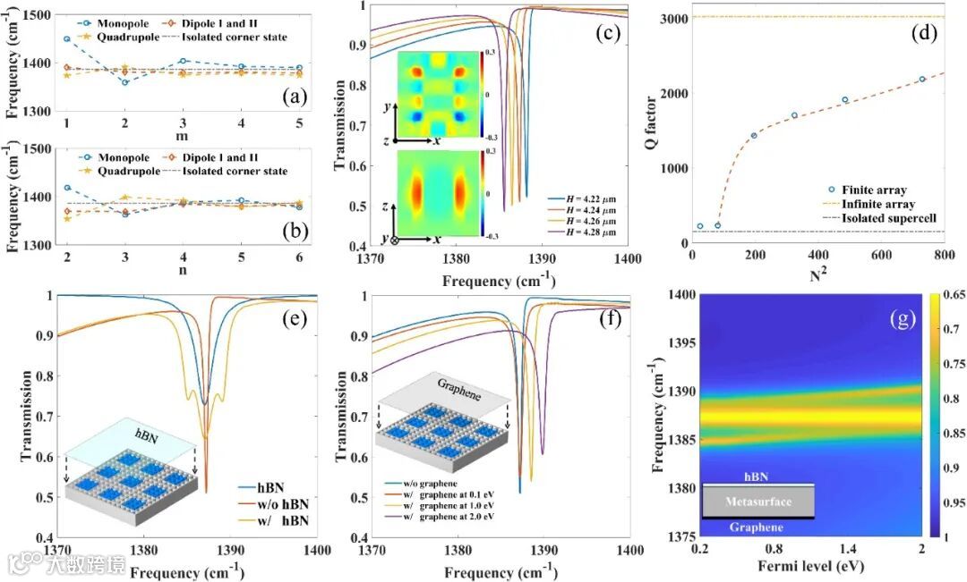 图2 (a-b) 光学耦合打破多极拓扑角态的简并性;(c) 偶极拓扑角态的光谱特征与磁场分布;(d) 偶极拓扑角态品质因子随阵列规模增加;(e) 六方氮化硼中声子与拓扑角态的强耦合现象;(f) 石墨烯费米能级对拓扑角态的调节;(g) 石墨烯助力动态调节拓扑声子极化激元。