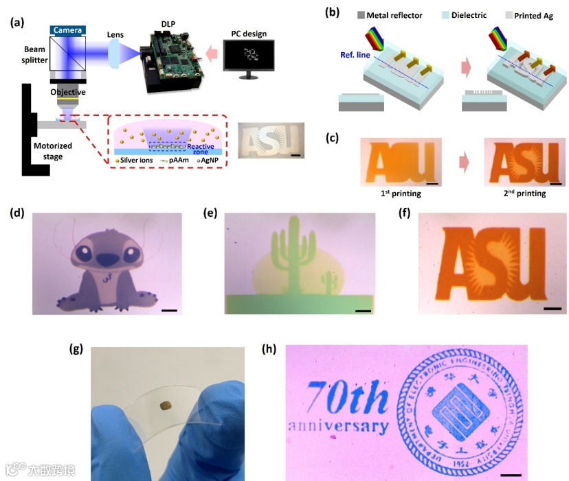 微纳加工的工艺可以实现高精准、高分辨率的彩色打印,但其较复杂、成本较高,因此应用受到了一定程度上的限制。最近,亚利桑那州立大学的王超和姚宇两位教授合作,采用增材制造工艺实现彩色图案打印。在这项工作中,科学家无需光刻、薄膜淀积、刻蚀等复杂的微纳加工工艺,而是以光为笔来直接“创造颜色”。具体一些讲,该团队采用紫外光对溶液中的金属(银)进行光化学还原,从而灵活可控地生成金属薄膜图案。作者设计了基于多层薄膜结构的法布里-珀罗 (FP) 腔作为“颜料”,通过调节金属膜厚和FP光腔薄膜厚度以吸收特定波长的光,从而可以“画出”不同图案并且“染上”不同颜色。使用这种新颖的设计方案,作者能够打印出具有高对比度的蓝色、绿色、黄色和橙色图片,从而实现微米级别精度的增材彩色打印。