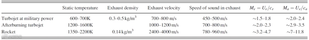 表1:基于McInerny(1992b,2010)的涡轮喷气发动机、加力涡轮喷气发动机和典型火箭变量的代表性比较。请注意,有些数值可能无法代表第五代加力军用飞机。