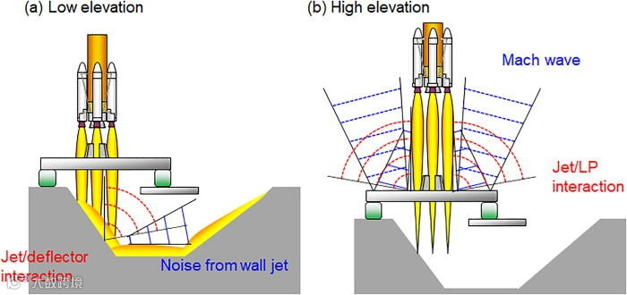 典型火箭羽流与其他喷射流的另一个区别在于它们在现实世界中的应用。军用飞机的操作包括喷气导流板,有时还包括短程起飞和垂直着陆(STOVL:Short TakeOff and Vertical Landings),但航天器发射更为复杂。火箭从一个发射台发射,该平台由一个导流板和火焰导管组成,用于安全引导下游高速和高温排气射流,一个用于支撑和运输运载工具的发射平台,以及一个用于为运载工具提供干燥空气、燃料和动力的脐带塔。发射平台位于偏转器上方,并有一个排气孔,用于将火箭发动机的排气喷嘴输送至偏转器和火焰管道。发射配置具有复杂的结构和羽流冲击和偏转,有可能极大地改变相关的噪声产生。