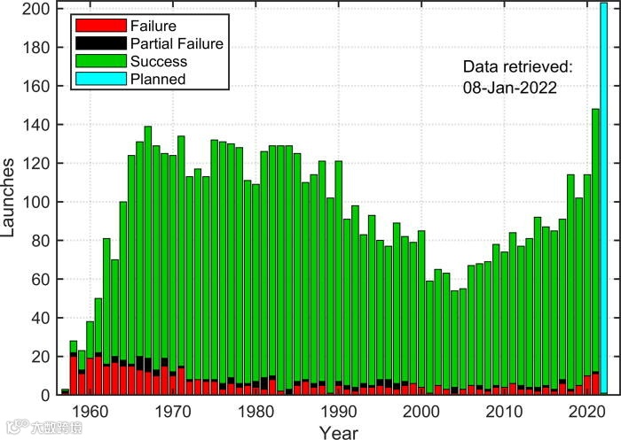 距离SP-8072已有5个十年,我们已经进入了全球太空飞行的新时代。如下图所示,美国航天飞机时代(1981年至2011年)的大部分时间都发生在全球与太空相关的活动相对平静期间,但最近有许多与人类探索、科学和休闲旅行相关的国家和国际举措— — 显著的技术进步使它们成为可能 — — 这意味着全球每年的轨道发射数量在过去10-15年中一直在稳步增加。计划在2022年发射的总次数将大大超过200次。日本、韩国、印度、中国、俄罗斯和美国只是全球目前正在开发运载火箭的众多国家中的一部分。关于印度运载火箭发展的回顾,可参考Gupta等人(2007年)的著述,Lipnitskiy和Safronov(2014年)提供了俄罗斯运载火箭项目地面声学测试的总结。