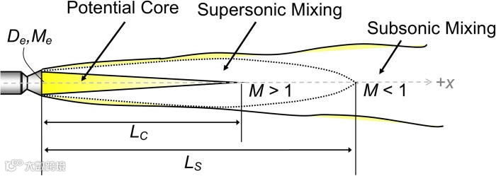 图:超音速喷射的结构示意。Lc是指潜在的核心长度,LS是指超音速核心长度。