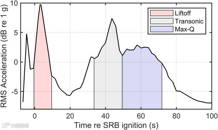 火箭发射产生巨大的声能。例如,在3700 kN推力的日本M-V固体发射器的有效载荷整流罩内外测得的总声压级(OASPL:Overall Sound Pressure Level)分别达到144和158分贝(dB)(Onoda和Minesugi,1997年)。由于升空通常是航天器在正常寿命期间将承受的最恶劣的动态环境,因此准确预测此时火箭产生的噪声至关重要。下图显示了航天飞机的均方根(rms:root mean square)振动与火箭助推器点火时间的函数关系。初始振动峰值是由主发动机点火引起的,之后,当航天飞机在发射台上方约90米处升空时,最大振动发生在∼5 s。请注意,当空气动力学抖振最大时,与跨音速和Max-Q阶段相比,飞行器上的升空声振载荷(VAL:VibroAcoustic Loading)会引起更大的振动。虽然这些阶段也会导致飞行过程中的结构振动,但火箭发射的发射阶段会产生潜在的破坏性VAL。