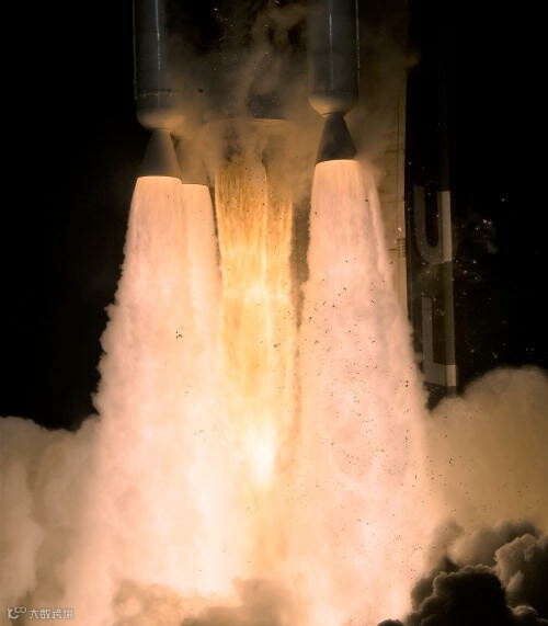 图:2020年3月,Atlas V-541火箭发射了“毅力号”(Perseverance)火星漫游车。液芯级发动机羽流显示出明显的过度膨胀迹象,而外部固体助推器羽流的结构被燃烧的铝颗粒所掩盖。照片由NASA提供。