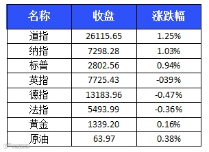 周三美股强势攀升,三大股指齐创历史新高,道指大涨逾300点,首次收于26000点上方,科技股推动纳指收高1.03%。企业季度业绩首秀靓丽成为推动美股上涨的主要原因。截至收盘,道琼斯工业平均指数收涨322.79点,涨幅1.25%,报26115.65点;纳斯达克综合指数收涨74.59点,涨幅1.03%,报7298.28点;标普500指数收涨26.14点,涨幅0.94%,报2802.56点。