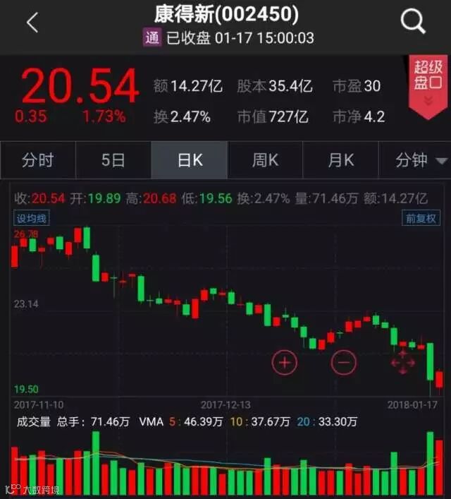 康得新自去年11月22日以来,走出了一波阴跌走势,跌幅达22.93%,近期更是出现了股价急跌的现象。17日晚间公司公告控股股东斥资10亿元增持计划,康得新这一幕似曾相识,在去年7月25日就曾上演,股价很快反身向上,最大涨幅接近40%。公司预计2017年全年净利润变动区间为25.52亿至27.48亿,变动幅度为30%至40%。公司主业为预涂膜及覆膜设备的开发、生产及销售。长期以来被市场当做白马股,可近半年来,股价偶有大幅波动,投资者还需谨慎对待。