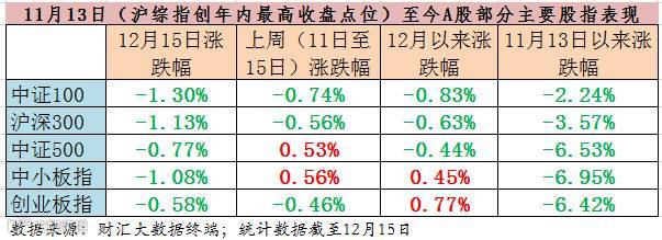 回顾上周A股的整体市况,在市场成交量能持续低企、市场做多信心整体不足的背景下,两市主要股指整体呈现出震荡偏弱的运行格局。而从个股结构性表现来看,由于前期股价表现突出的白马蓝筹板块整体强势不再,两市个股的“二八分化”特征也显著收敛。一方面,类似中国平安、贵州茅台、海康威视、格力电器等年内市场明星股,普遍跟随大盘震荡走弱;另一方面,部分前期跌幅较大的中小市值个股,则纷纷在低位展开阶段性反弹。仅以12月A股相关股指的表现来看,多个中小指数就略强于沪深300等指数的走势。
