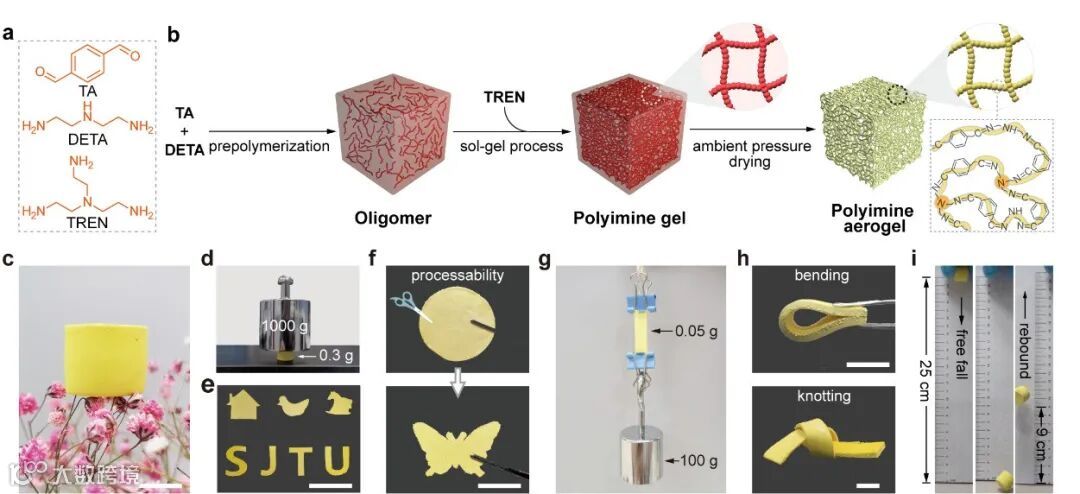 动态共价聚合物气凝胶的制备过程、亚胺键交联网络及气凝胶的宏观性能。