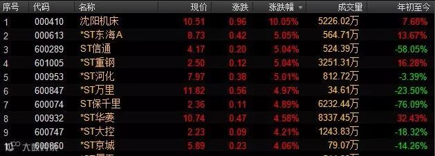在沈阳机床摘帽涨停的带动下,今日整个ST板块走势强劲,5只ST股涨停,10只ST股涨幅超4%。