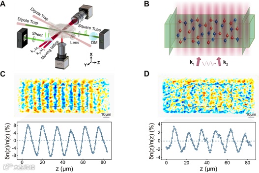 在该项工作中,中国科大研究团队经过4年多的艰苦攻关,搭建了一个全新的超冷锂-镝原子量子模拟平台,融合发展了灰色黏团与算法冷却、盒型光势阱等先进的超冷原子调控技术,最终成功地实现了世界领先的均匀费米气体的制备;与此同时,研究团队还基于低噪声行波光晶格与高分辨原位成像技术,实验实现并理论诠释了低动量传递(约百分之五的费米动量)与高能量分辨率(优于千分之一的费米能)的布拉格谱学方法,并利用其实现了对体系密度响应的高分辨测量。在取得上述两项关键技术突破的基础上,研究团队成功地在幺正费米超流体的密度响应中观测到了第二声的信号(如图1(D)所示),并获得了完整的幺正费米超流体的密度响应谱,实验结果与基于耗散两流体理论的描述高度吻合。