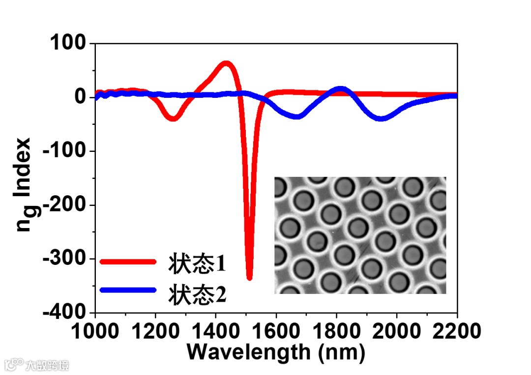 图 2:光控全介质EIT超构表面的可调控慢光(群折射率)特性,右下角为光控全介质EIT超构表面的扫描电镜图(SEM)