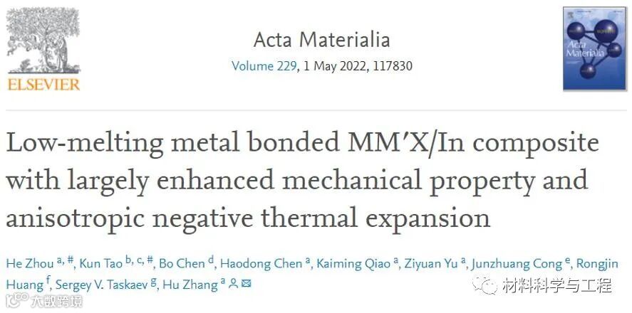 北京科技大学的张虎课题组使用低熔点金属In作为粘结剂,使用热压的方法制备了金属In粘结Mn0.6Fe0.4NiGe0.5Si0.5粉末的MM¢X/In复合材料。该方法利用金属In的高流动性以及高热导率,使MM¢X/In复合材料获得密实的结构,从而显著提高材料的机械性能和热导率。相关论文以题为“Low-melting metal bonded MM'X/In composite with largely enhanced mechanical property and anisotropic negative thermal expansion”发表在Acta Materialia。