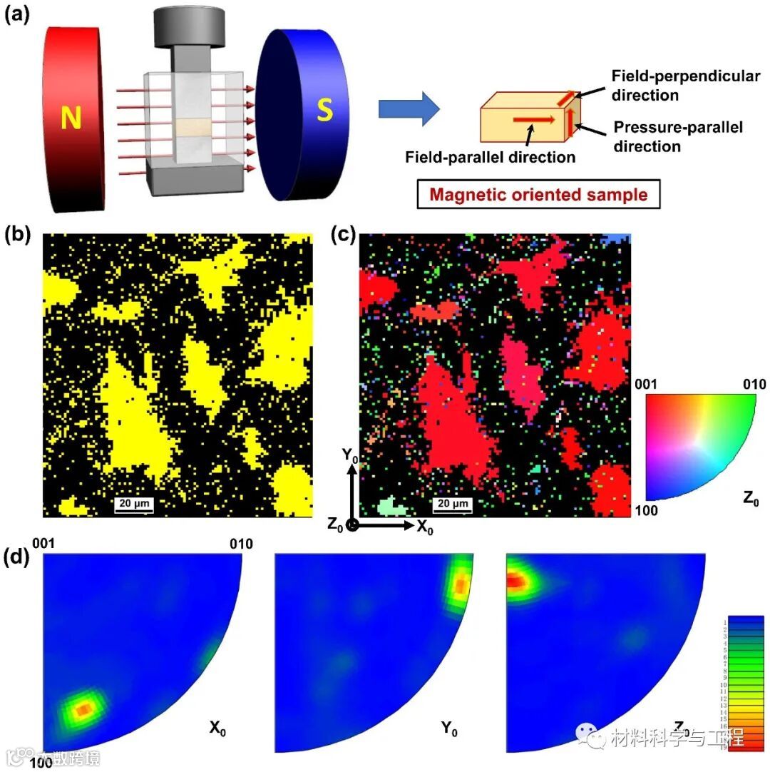 图3 (a) 磁场取向样品的制备示意图;(b‒d) 磁取向样品的晶体取向研究