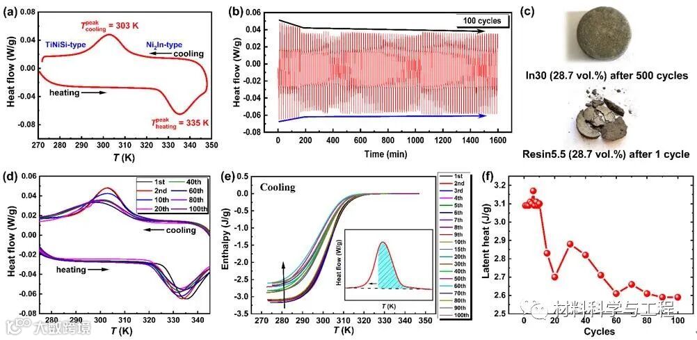 研究发现,MM¢X/In复合材料呈现出致密的结构,低孔隙率使其获得优异的机械性能,并且热导率可达到15 W/m K,循环稳定性测试表明MM¢X/In复合材料具有可靠的功能稳定性。30 wt.%In含量的MM¢X/In复合材料(In30)会表现出比典型磁热材料金属Gd更优异的磁热性能,因而可作为磁制冷的候选材料。另外,In30会在室温附近的宽温区表现出零热膨胀,而磁取向In30则会表现出各向异性热膨胀,这归因于MM¢X化合物在结构转变过程中各晶轴不同的热膨胀行为。