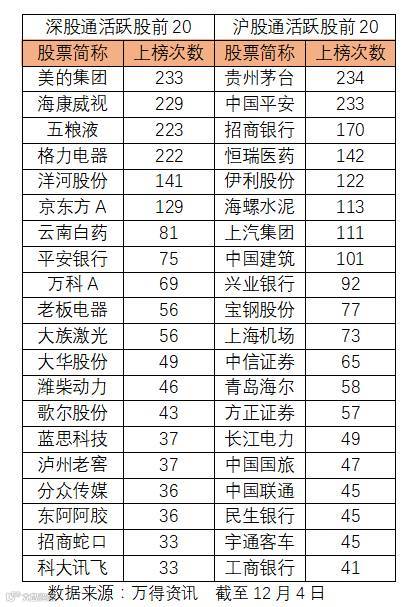陆股通每日成交十大活跃股的数据,也印证了北向资金对这些股票的厚爱。纵观近一年来的上榜活跃股名单,深股通的前11大活跃股,去掉万科A后恰好就是深股通持有市值的前十股票。沪股通前20大活跃股,也完全涵盖了沪股通持有市值的前十股票。