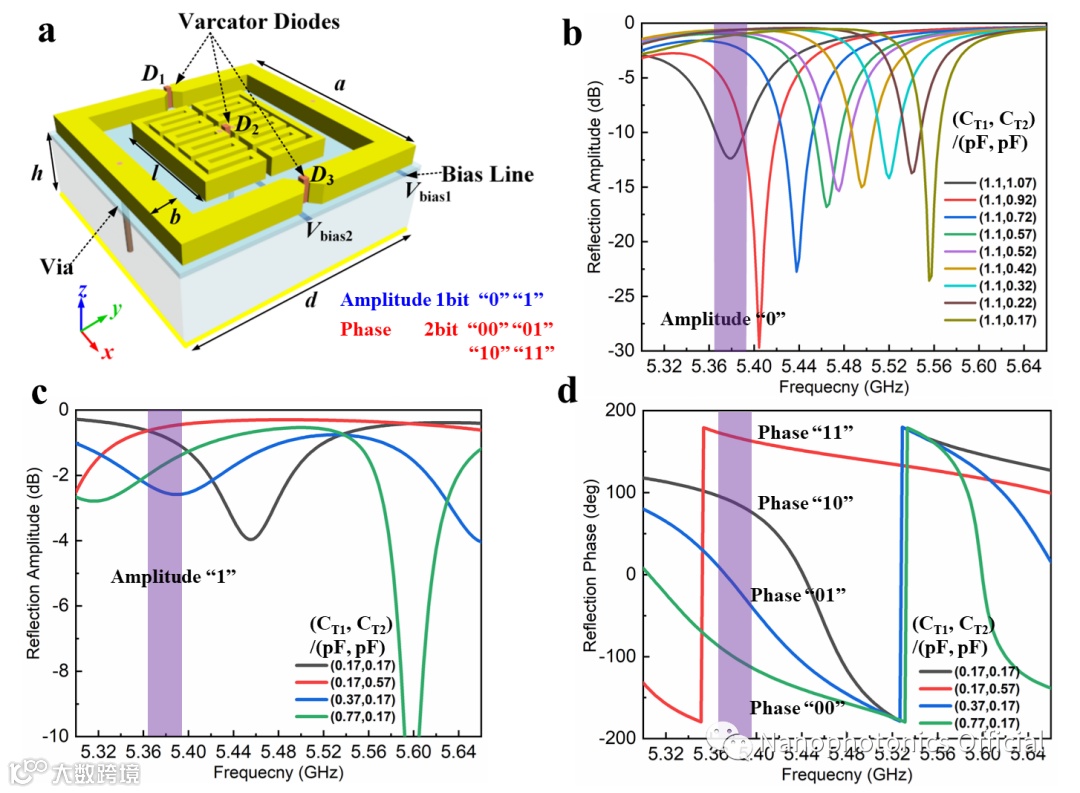 研究人员首先提出了一种具有特殊设计的反射式超表面单元以实现反射幅度和相位的独立控制(见图2),单元顶层金属贴片由三环结构组成,其中外环为开口环,两个内环为闭环。为了将相位和幅度控制保持在同一频段,内环选择带有蜿蜒线的金属环,可有效地增加等效电感,使其与外环保持一致。因此,对于这种谐振型反射单元,主要通过改变外环之间加载的变容二极管的电容来调整反射相位,内环加载的二极管负责调节反射幅度。基于电磁仿真计算和单元波导实验测试结果均证明了该单元设计可实现1bit反射幅度响应和2bit反射相位响应的独立控制。