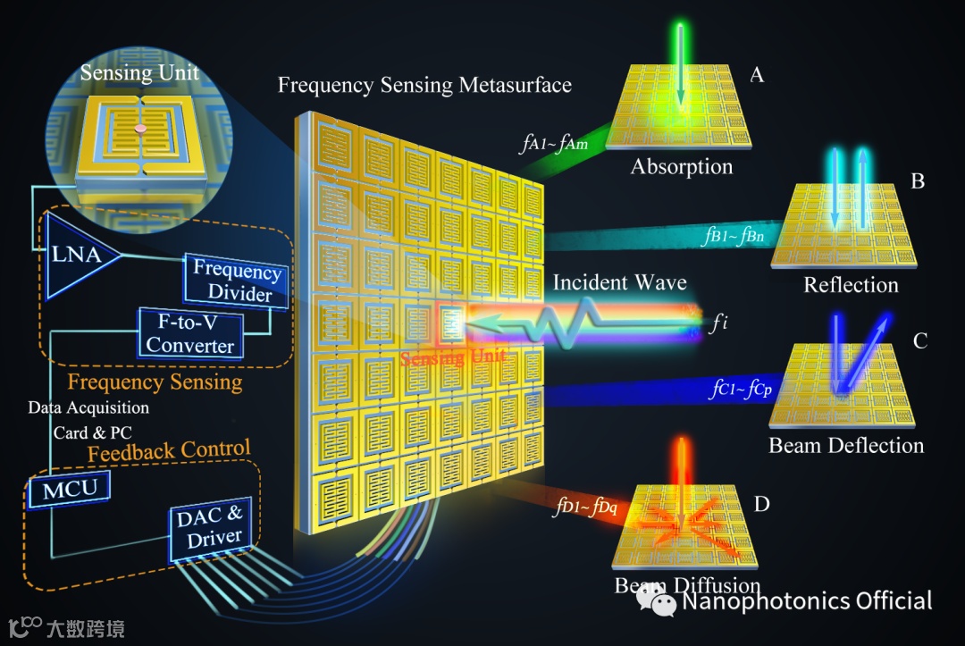 针对这些问题,近日东南大学毫米波国家重点实验室王海鹏博士、李允博副研究员、金石教授和崔铁军教授等在Nanophotonics发表最新文章,提出了一种频率识别智能超表面系统,可用于自适应控制空间电磁波(见图1)。通过设计具有2bit相位和1bit幅度独立编码控制能力的有源超表面单元,结合射频频率感知模块和自适应反馈控制系统,可以实时、精确控制窄带频率下的空间电磁波。实验结果表明,在无需任何人工参与情况下,该自适应超表面可以0.02 GHz的分辨率快速识别入射波频率,并在超窄带频段自适应地实现自定义的功能来操纵反射波,如吸波、全反射、波束偏折和随机散射等。