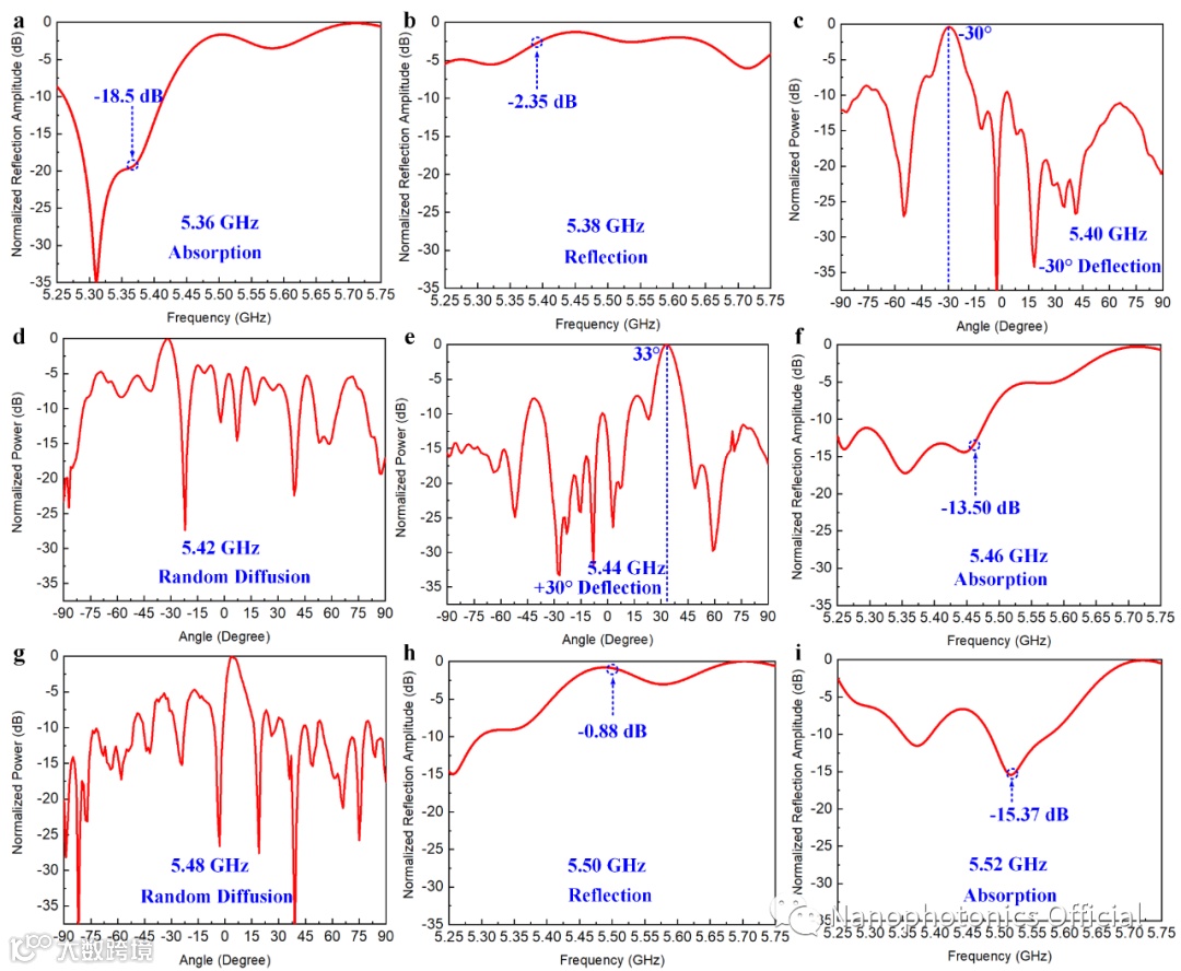 随后,研究人员对电磁超表面的中心传感单元进行单独设计,即在原始单元中间焊接变容二极管的位置(两个内环之间的间隙处)设计了一个传感点,并焊接SMA连接器替代变容二极管。通过该传感单元中的两个金属内贴片捕获的空间入射能量通过SMA连接器进入频率感知模块。其主要由低噪声放大器(LNA)、三个分频器、精密频率电压转换器和模数转换器(ADC)组成。频率感知模块的输出与入射波的频率呈线性关系直流电压信号,并通过使用ADC获得入射波的频率信息,之后通过自行设计的自适应反馈控制系统(由微控制器和可编程直流电源组成)改变变容二极管电压偏置来动态控制和切换超表面功能。实验结果从图3中可以看出,对应预定义频率可以准确识别频率并实现吸波(5.36 GHz)、反射(5.38 GHz)、-30度偏折(5.40 GHz)、随机散射(5.42 GHz)、+30度偏折(5.44 GHz)、吸波(5.46 GHz)、随机散射(5.48 GHz)、反射(5.50 GHz)、吸波(5.52 GHz)。
