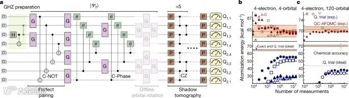 多电子相互作用问题,在科学领域提出了一些最大的计算挑战,并在许多领域提出了基本的应用。这些问题的解决方案,将提供准确的预测化学反应性和动力学,以及其他性质的量子系统。费米量子蒙特卡罗(QMC)方法,使用基态的统计抽样,是解决这些问题的最有力的方法之一。用约束来控制费米符号问题保证了QMC的效率,但代价是由于经典计算的灵活性有限而可能存在显著的偏差。在此,来自美国谷歌量子人工智能的William J. Huggins& 哥伦比亚大学的Joonho Lee等研究者提出了一种将约束QMC与量子计算相结合的方法,来减少这种偏差。相关论文以题为“Unbiasing fermionic quantum Monte Carlo with a quantum computer”于2022年03月16日发表在Nature上。寻找Schrödinger方程的精确解的复杂性,似乎随着系统中电子的数量呈指数增长。这一事实,极大地阻碍了精确计算复杂系统基态量子力学性质的有效方法的进展。在过去的一个世纪里,大量的研究工作致力于开发解决这个多电子问题的新算法。目前,所有可用的通用方法可分为两类:(1)随系统规模呈指数级伸缩而给出精确数值答案的方法;(2)成本随系统规模呈多项式级伸缩但仅通过构造近似的方法。这第二类方法是目前唯一可行地应用于大型系统的方法。通过这些方法得到的解的准确度往往不令人满意,而且几乎总是难以评估。量子计算已经成为量子性质计算的一种替代模型,在效率方面,它可能补充并潜在地超越经典方法。虽然这一领域的最终目标是构建一个通用容错量子计算机,但目前的实验设备仅限于嘈杂的中尺度量子(NISQ)计算机。基态计算的NISQ算法主要集中在变分量子本征求解器(VQE)框架上,需要解决优化困难、测量开销和电路噪声等问题。作为一种替代方法,人们提出了基于假想时间进化的算法,该算法原则上避免了优化问题。然而,由于虚拟时间演化的非酉性质,必须借助启发式来实现系统规模的合理伸缩。避免这些限制的新策略,可能有助于在费米子模拟中,实现第一个实际的量子优势。在此,研究者提出并实验演示了一类量子-经典混合算法,为解决这些挑战提供了一种不同的途径。研究者没有尝试使用量子处理器来表示基态波函数,而是选择使用它来指导在经典协处理器上执行的量子蒙特卡罗(QMC)计算。利用这种方法,研究者的实验论证规模超过了以往在化学量子模拟方面的实验工作。研究者在实验中实现了他们的方案,使用了多达16个量子比特来进行无偏约束QMC计算,这些计算是在多达120个轨道的化学系统上进行的。这些实验代表了在量子计算机的帮助下进行的最大的化学模拟,同时实现了与最先进的经典方法竞争的精度,而不需要负担的错误缓解。