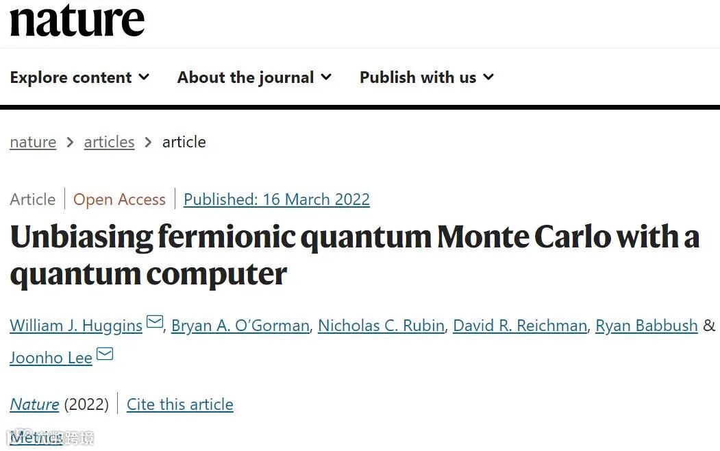 图3. 12量子比特和16量子比特实验综上所述,研究者提出了一种可扩展的、抗噪声的量子-经典混合算法,该算法无缝地将一个特殊用途的量子原语嵌入到精确的量子计算多体方法中,即QMC。该工作提供了一种计算策略,通过利用最先进的量子信息工具,有效地无偏见费米QMC方法。研究者已经为一种特定的称为AFQMC的QMC算法实现了这种算法,并在实验中展示了它在NISQ处理器上高达16量子比特的性能,产生的电子能量可以与最先进的经典量子化学方法竞争。研究者的算法还能在不增加量子资源或测量开销的情况下,将量子计算机处理的空间外的电子相关能结合起来。文献信息Huggins, W.J., O’Gorman, B.A., Rubin, N.C. et al. Unbiasing fermionic quantum Monte Carlo with a quantum computer. Nature (2022). https://doi.org/10.1038/s41586-021-04351-z