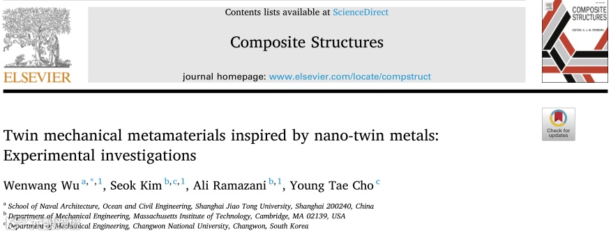 WenwangWu, Seok Kim, Ali Ramazani,YoungTae Cho, Twin mechanical metamaterials inspired by nano-twin metals:Experimental investigations, Composite Structures, 291, 2022, 115580.
