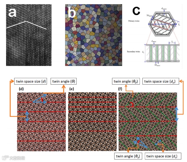 图1:纳米孪晶微结构启发的机械超材料设计:(a)均匀尺寸特征纳米孪晶;(b)功能梯度结构纳米孪晶;(c)多层级纳米孪晶:(d)均匀尺寸特征孪晶机械超材料;(e)功能梯度结构孪晶机械超材料;(f)多层级孪晶机械超材料。