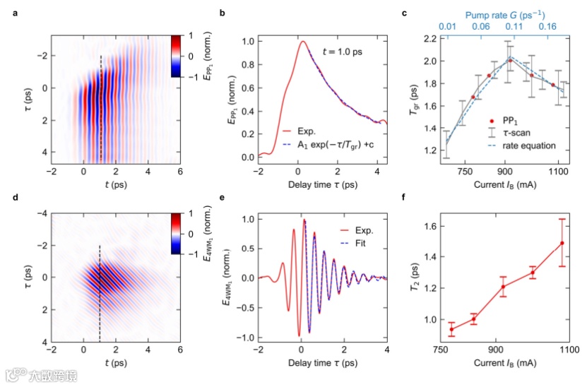 图三:QCL 中相干和非相干动力学的定量分析。(a)对应泵浦探测信号EPP1的逆变换电场。(b)延迟时间t=1.0ps时,EPP1(t,τ)关于τ的函数(对应于(a)中的黑色虚线)。蓝色虚线:数值拟合结果。(c)从 PP1信号(红点)和全非线性时域信号(灰色)中提取的QCL的增益恢复时间 Tgr 关于偏置电流的函数。 误差条显示数值拟合的不确定性。浅蓝色虚线:Tgr 关于泵速 G的函数,由速率方程模型中提取。(d)对应四波混合信号E4WM1的逆变换电场。(e)延迟时间t=1.0ps时,E4WM1 (t,τ)关于τ的函数(对应于(d)中的黑色虚线)。蓝色虚线:数值拟合结果。(f)相干布居T2的衰减时间关于偏置电流的函数。误差显示了 0.45ps和1.75ps之间不同延迟时间的T2不确定度。