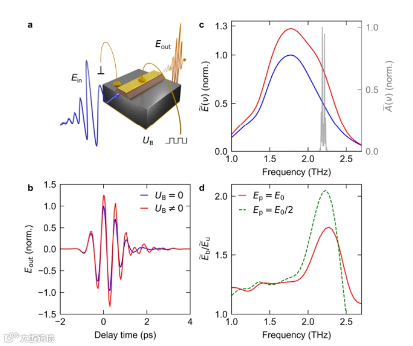 图一:太赫兹QCL的高频场光谱。(a)实验设置示意图。灰色:GaAs衬底;红色:活性介质;金色:波导与电触点。太赫兹波形Ein(蓝色箭头线)聚焦在 QCL 面上,透射波形Eout(橙色箭头线)则通过光电检测。偏置电压的矩形调制使得研究人员可以提取非线性响应的电流感应变化。(b)测量的太赫兹波形关于延迟时间 t 的函数,在通过 QCL 传输后,带有(红色实线)和不带有(蓝色实线)偏置电流。(c)(b)中波形的幅度谱(对应(b)中线条颜色)和QCL的激光谱(灰色实线)。(d)QCL传输调制关于频率的函数,定义为两个峰值电场(分别用红色实线和绿色虚线表示)在偏置QCL与非偏置QCL下的传输谱。
