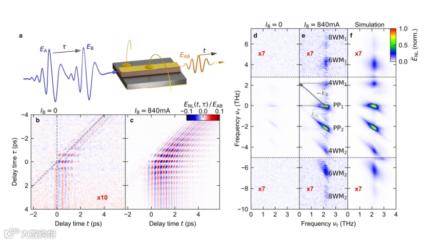 图二:自由运行的QCL的二维场分辨太赫兹光谱。(a)实验设置示意图。太赫兹波形EA和EB(蓝色箭头线)聚焦于QCL面上,透射波形(EAB,橙色箭头线)则通过光电检测。(b)由非偏置QCL的非线性偏振产生的电场ENL(t,τ)关于延迟时间t和τ的函数。电场乘以了系数10并且按照(c)中所展示的图例进行了颜色编码。(c)与(b)中类似的ENL(t,τ),但是是在电流为IB=840mA的条件下由偏置QCL所产生的。(d)ENL(vt,vτ)对于(b)中非线性响应(IB=0)的二维幅度谱。对于vt<-5THz和vτ>2.8THz范围的场,乘以了系数7。(e)ENL(vt,vτ)对于(c)中非线性响应(IB=840mA)的二维幅度谱。为了更好地观察 6WM 和 8WM 信号,频谱的相应部分乘以系数 7。(f)模拟所得的对应二维幅度谱。