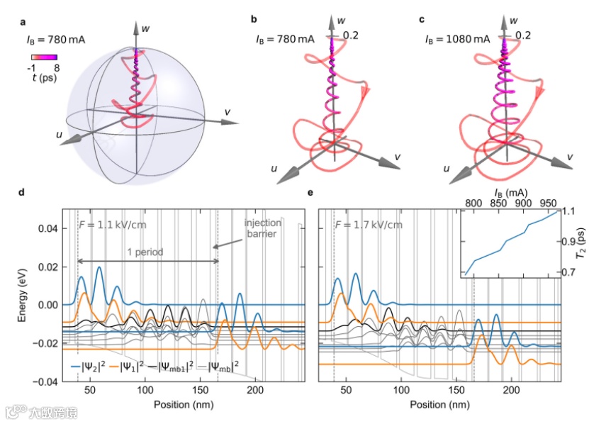 图四:QCL动力学的微观图像。(a)在一个半径为0.2的bloch球体中展示的QCL的密度矩阵的时间演化,延迟时间τ=0ps,偏置电流IB=780mA。(b)(a)中bloch轨迹的特写视图。(c)与(b)类似,不同的是偏置电流IB=1080mA.(d)在F=1.1kV/cm的电场下QCL的模拟能带图。蓝色实线和橙色实线代表上下激光能级的波函数的平方模(分别为|Ψ2|2和|Ψ1|2)。此外,最高迷你带态|Ψmb1|2以及其他迷你带态|Ψmb |2也用黑色和灰色实线在图中进行了展示。(e)与(d)类似,不同的是偏置电压为F=1.7kV/cm。小插图为计算得到的T2关于偏置电流IB的依赖性。