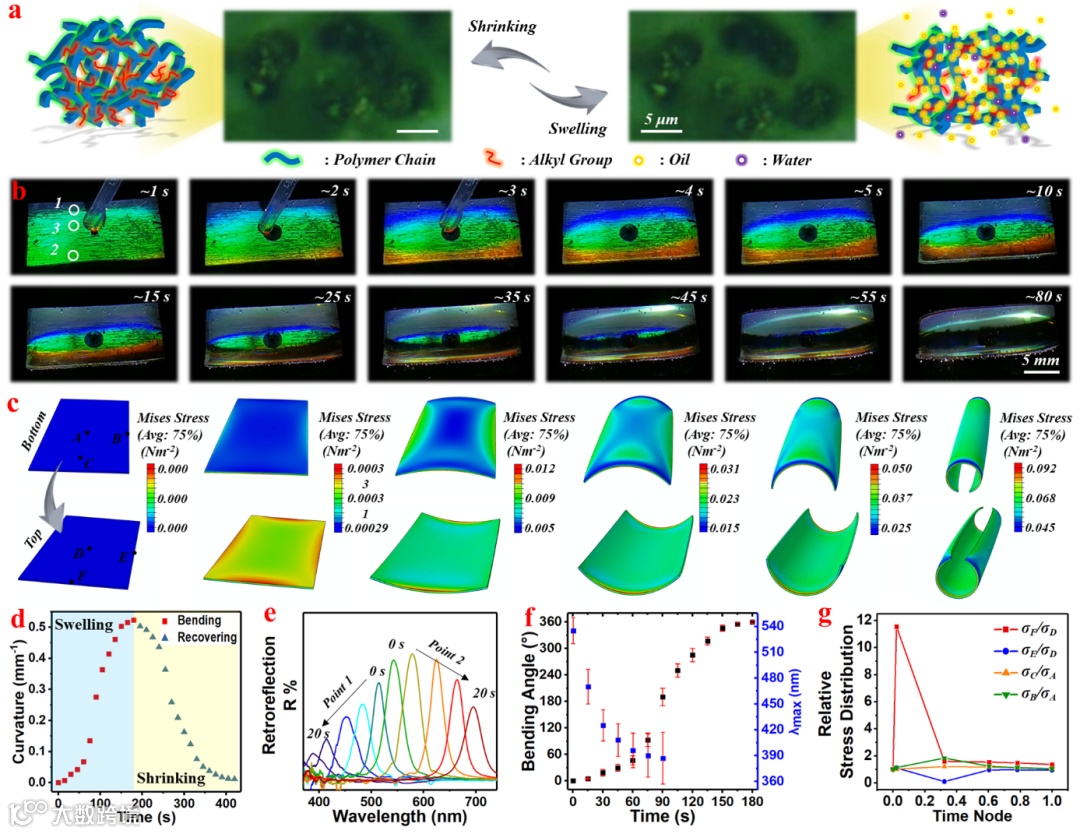 如图3a所示,通过光学显微镜观察了超疏水层表面铜微纳阵列的溶胀过程,溶胀后,铜阵列间距明显增大。Janus膜正反面的不对称溶胀最终促使软致动器弯曲。弯曲前,亲水层表面的反蛋白石可在光源方向产生角度依赖的逆反射光(图3b),初始入射角和观察角分别为~60°和~50°时,亲水层显示绿色。弯曲过程中,由于不同弧度处的入射角和观察角实时变化,对应反蛋白石的逆反射发生变化,整个曲面显示不同的结构色。通过有限元模拟分析了超疏水层的顶部和底部的内应力分布变化。顶部内应力分布密度从边缘向整个平面转移,而底部内应力分布密度从Janus膜的长边向四面转移,与观察到的结构色的变化过程相似。利用结构色可以揭示Janus膜弯曲过程中的相关动力学过程,并可视化分析内应力的变化和转移。